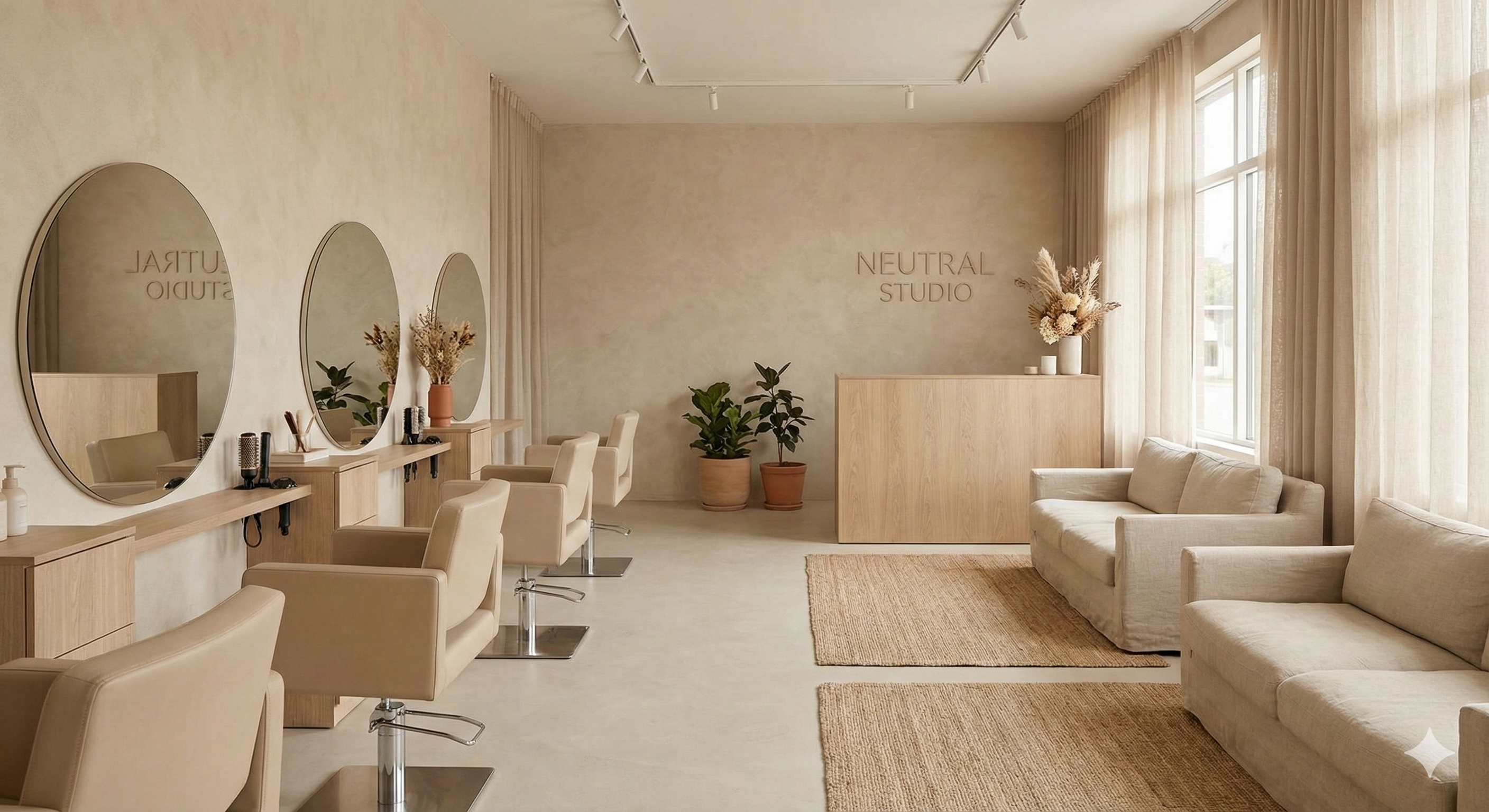 Beige, Weiß und Schwarz halten den Kopf frei. Du hörst Schere, Föhn und leise Musik. Mehr nicht.